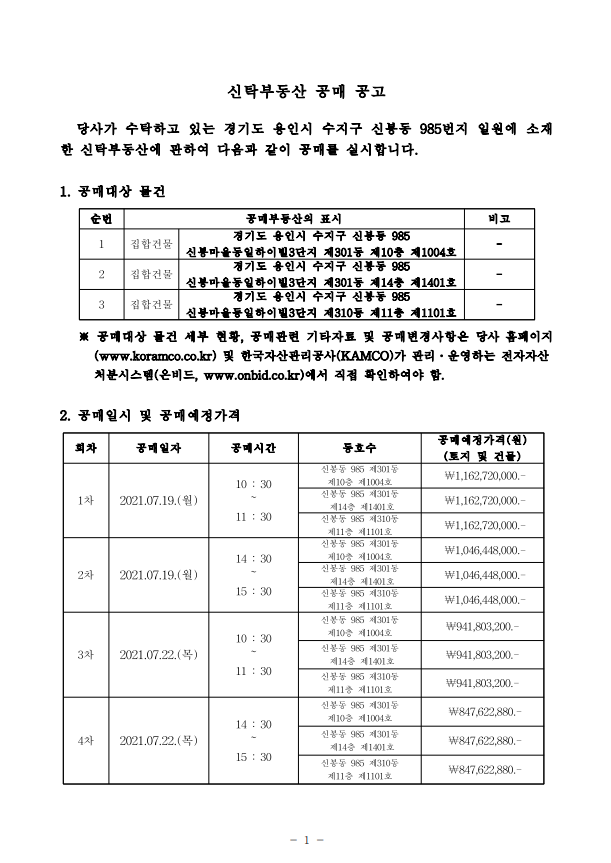 유찰 용인시 수지구 신봉동 985번지 일원 동일하이빌 3단지 3개 호실 신탁부동산 공매