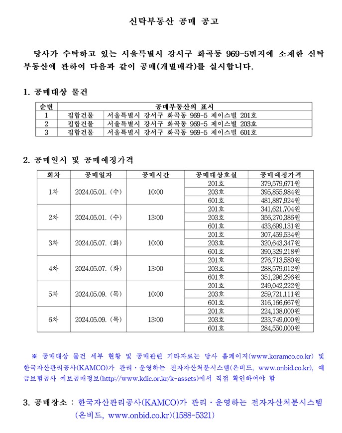 - 공매장소 : 한국자산관리공사(KAMCO)가 관리·운영하는 전자자산처분시스템 (온비드, www.onbid.co.kr)(1588-5321)
