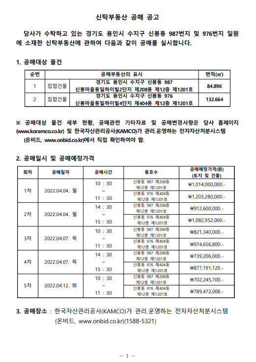 당사가 수탁중인 용인시 수지구 신봉동 987번지 일원  동일하이빌 2,4단지 총 2개 호실에 대한 신탁부동산 공매를 다음과 같이 실시합니다.