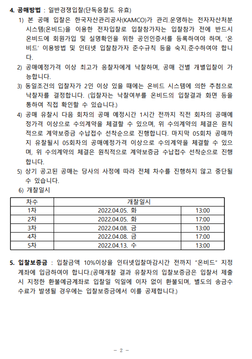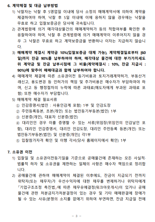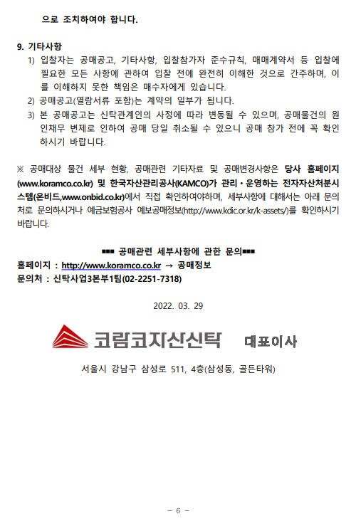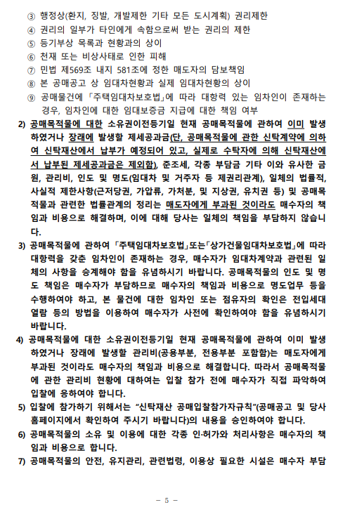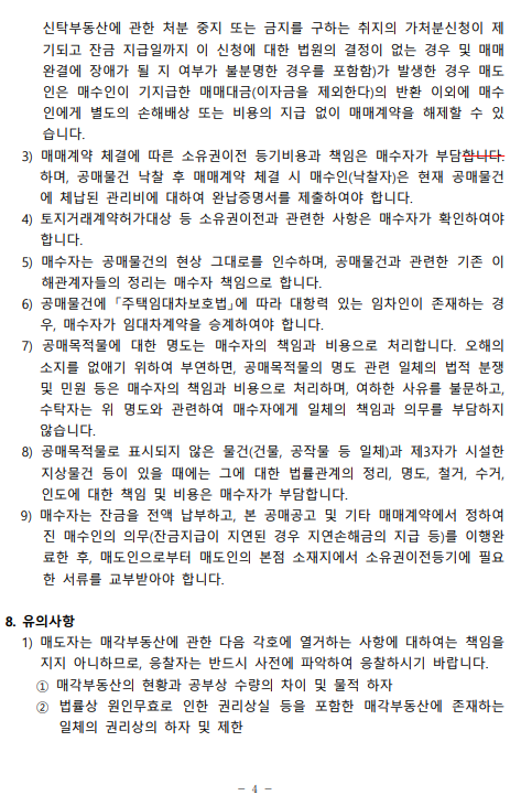 ※ 당사는 등기부상 최초 1회에 한하여 소유권 이전등기 업무만을 수행하고 이를 제외한 매매계약과 관련한 매도인으로서의 일체의 의무 및 책임(매매목적물의 모든 법률적·사실적 하자 또는 장애에 대한 매도인으로서의 의무 및 책임, 불법행위책임, 채무불이행책임 및 하자담보책임을 포함하되 이에 한정되지 않음)을 부담하지 않음을 안내드립니다. (자세한 사항은 첨부의 공매 공고, 매매계약서(안) 및 당사 홈페이지 '공매정보' 참조)