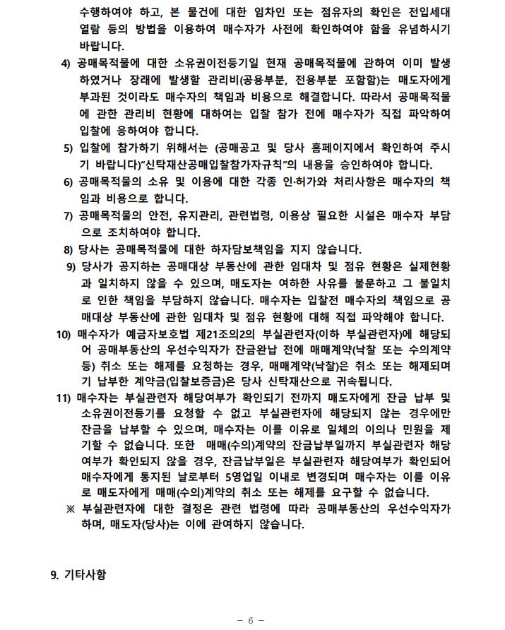 ※ 당사는 등기부상 최초 1회에 한하여 소유권 이전등기 업무만을 수행하고 이를 제외한 매매계약과 관련한 매도인으로서의 일체의 의무 및 책임(매매목적물의 모든 법률적·사실적 하자 또는 장애에 대한 매도인으로서의 의무 및 책임, 불법행위책임, 채무불이행책임 및 하자담보책임을 포함하되 이에 한정되지 않음)을 부담하지 않음을 안내드립니다.