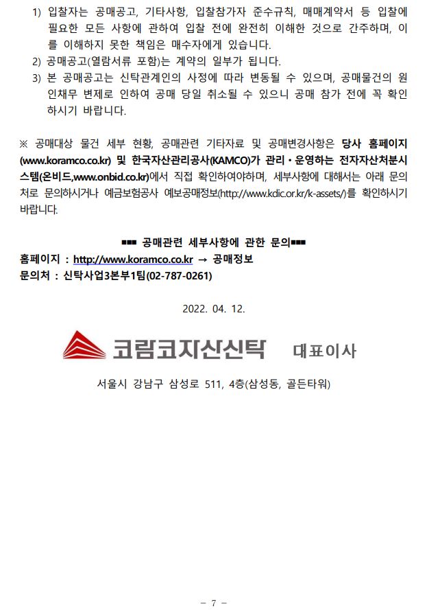 - 첨부파일의 매매계약서(안), 공매공고 및 입찰참가자 준수규칙 등을 반드시 확인하여 주시기 바랍니다.