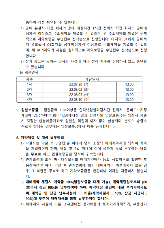 - 첨부파일의 매매계약서(안), 공매공고 및 입찰참가자 준수규칙 등을 반드시 확인하여 주시기 바랍니다.
