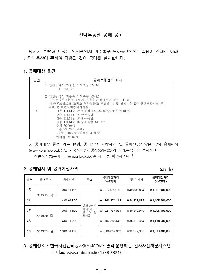 공매중지 인천광역시 미추홀구 도화동 93-32 근린생활시설 토지 및 건물 일괄공매