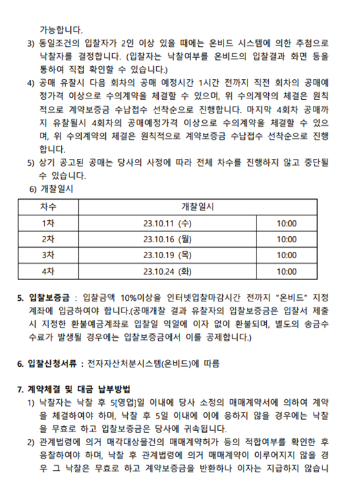 - 첨부파일의 매매계약서(안), 공매공고, 입찰참가자 준수규칙 등을 반드시 확인하여 주시기 바랍니다.