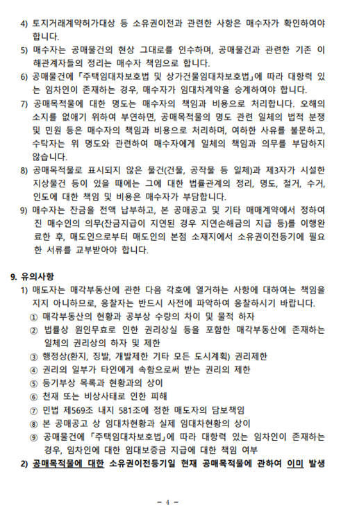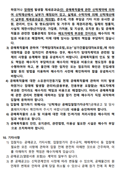 ※ 당사는 등기부상 최초 1회에 한하여 소유권 이전등기 업무만을 수행하고 이를 제외한 매매계약과 관련한 매도인으로서의 일체의 의무 및 책임(매매목적물의 모든 법률적·사실적 하자 또는 장애에 대한 매도인으로서의 의무 및 책임, 불법행위책임, 채무불이행책임 및 하자담보책임을 포함하되 이에 한정되지 않음)을 부담하지 않음을 안내드립니다. (자세한 사항은 첨부의 공매 공고, 매매계약서(안) 및 당사 홈페이지 '공매정보' 참조).