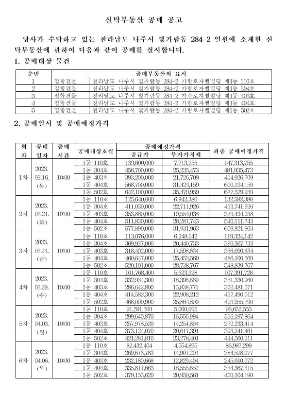 유찰 전남 나주시 빛가람동 284-2 가람로자벨빌딩 1동 110호 외4호실 근생 개별매각