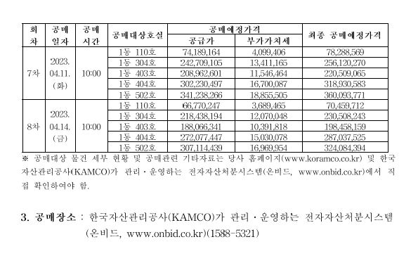 - 공매장소 : 한국자산관리공사(KAMCO)가 관리·운영하는 전자자산처분시스템 (온비드, www.onbid.co.kr)(1588-5321)