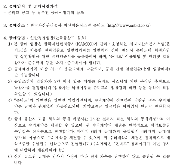 - 공매장소 : 한국자산관리공사(KAMCO)가 관리·운영하는 전자자산처분시스템 (온비드, www.onbid.co.kr)(1588-5321)