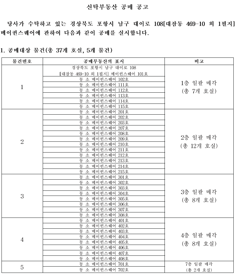 진행중 경상북도 포항시 남구 대잠동 메이퀸스퀘어 공매(층별 일괄매각)