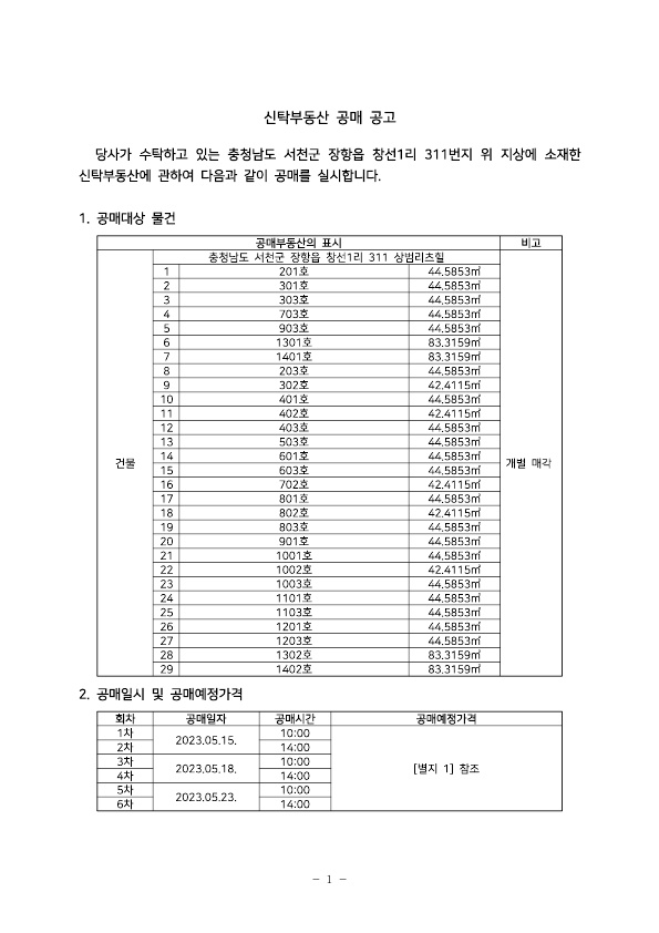 - 공매장소 : 한국자산관리공사(KAMCO)가 관리·운영하는 전자자산처분시스템 (온비드, www.onbid.co.kr)(1588-5321)