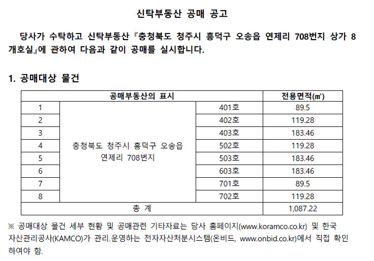 - 공매공고 및 입찰참가자 준수규칙 등을 한국자산관리공사(KAMCO)가 관리ㆍ운영하는 전자자산처분시스템(온비드, www.onbid.co.kr)에서 반드시 확인하여 주시기 바랍니다.