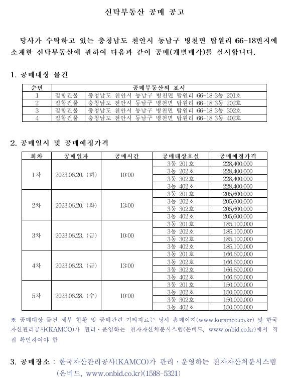 - 공매장소 : 한국자산관리공사(KAMCO)가 관리·운영하는 전자자산처분시스템 (온비드, www.onbid.co.kr)(1588-5321)