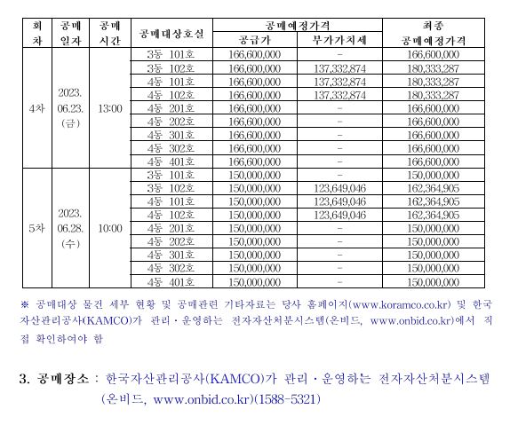 - 공매장소 : 한국자산관리공사(KAMCO)가 관리·운영하는 전자자산처분시스템 (온비드, www.onbid.co.kr)(1588-5321)