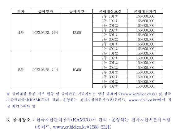 - 공매장소 : 한국자산관리공사(KAMCO)가 관리·운영하는 전자자산처분시스템 (온비드, www.onbid.co.kr)(1588-5321)
