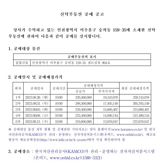 - 공매장소 : 한국자산관리공사(KAMCO)가 관리·운영하는 전자자산처분시스템 (온비드, www.onbid.co.kr)(1588-5321)