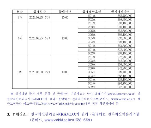- 공매장소 : 한국자산관리공사(KAMCO)가 관리·운영하는 전자자산처분시스템 (온비드, www.onbid.co.kr)(1588-5321)