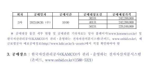 - 공매장소 : 한국자산관리공사(KAMCO)가 관리·운영하는 전자자산처분시스템 (온비드, www.onbid.co.kr)(1588-5321)