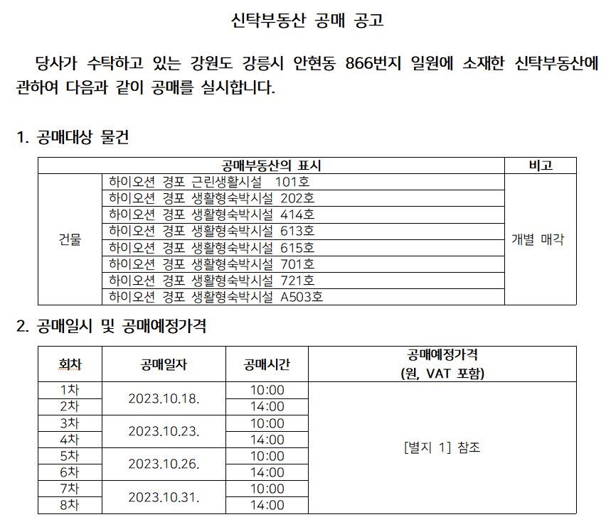 유찰 강릉시 안현동 866번지 하이오션경포 생활형숙박시설 및 근린생활시설 공매
