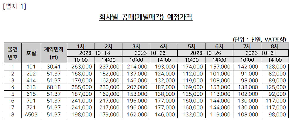 - 공매장소 : 한국자산관리공사(KAMCO)가 관리·운영하는 전자자산처분시스템 (온비드, www.onbid.co.kr)(1588-5321)