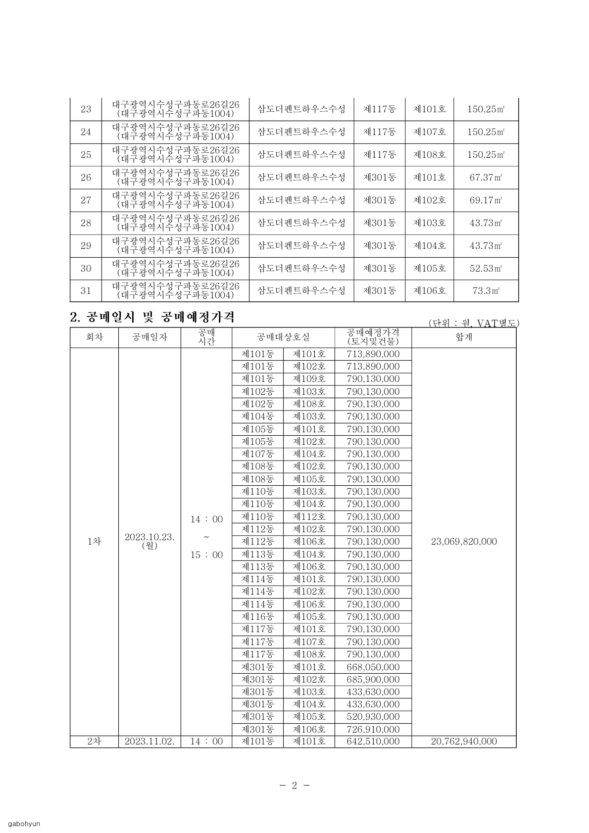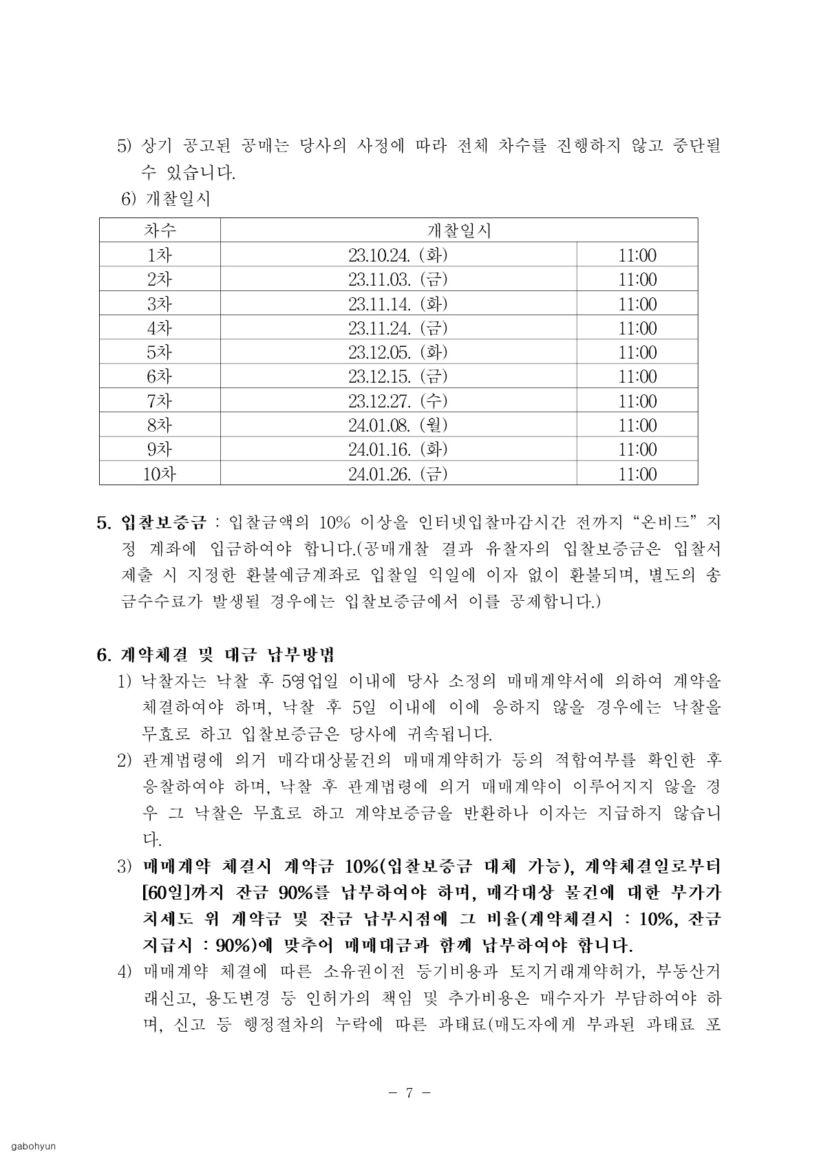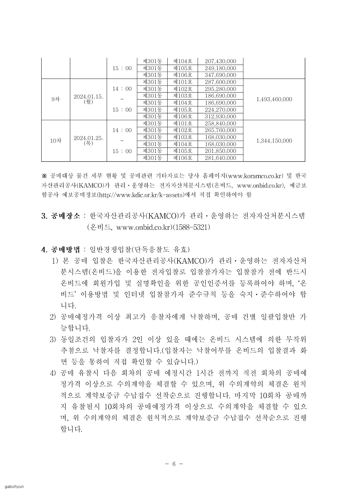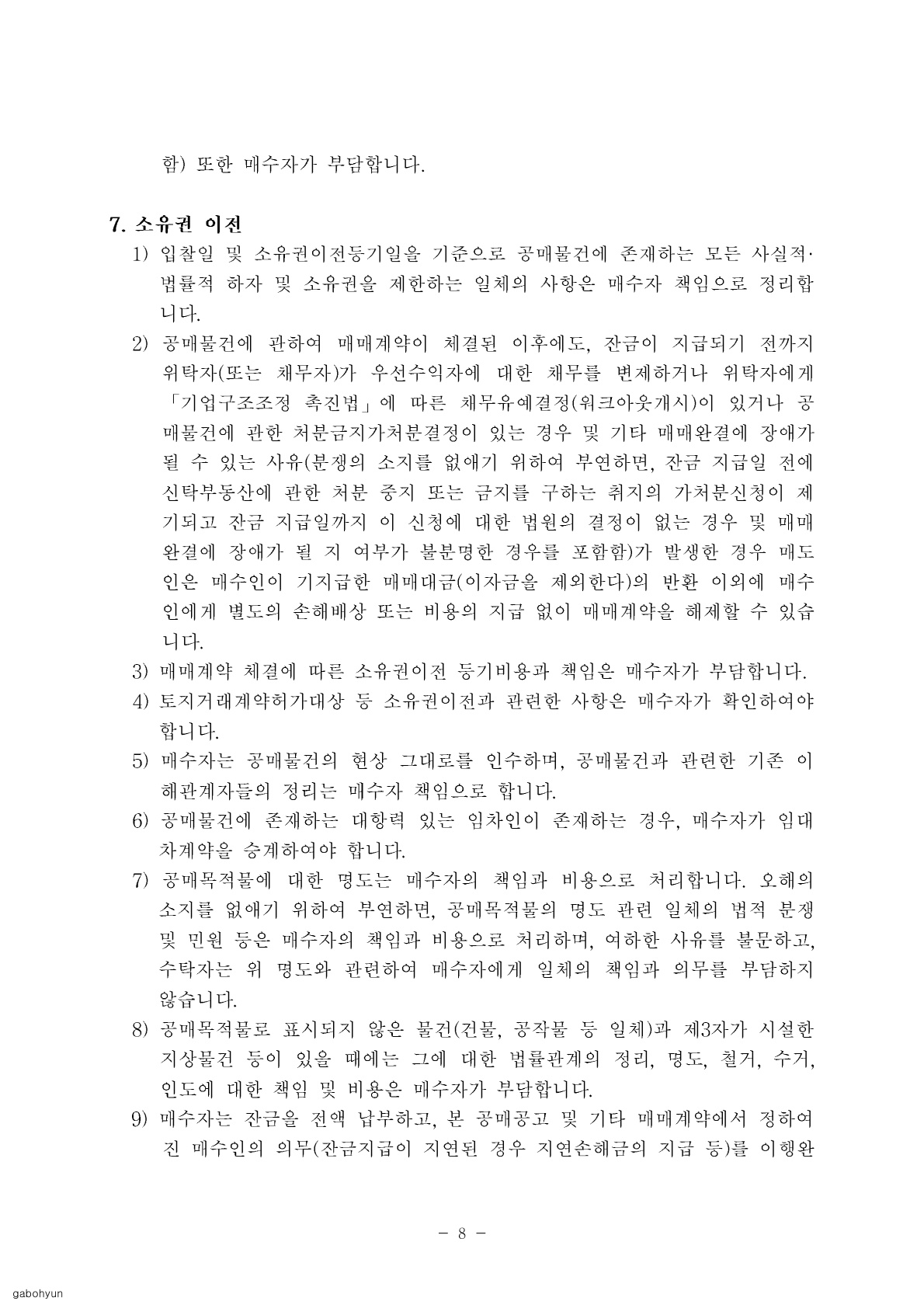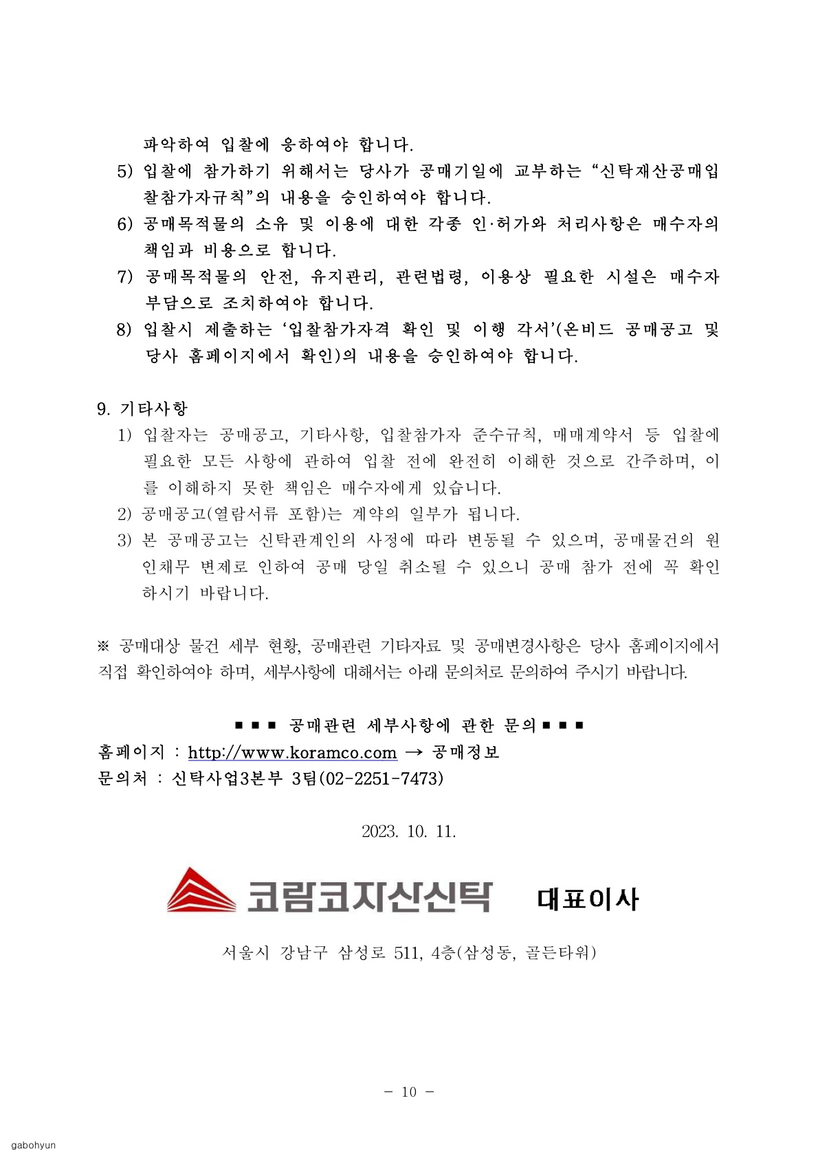 - 공매공고 및 입찰참가자 준수규칙 등을 한국자산관리공사(KAMCO)가 관리ㆍ운영하는 전자자산처분시스템(온비드, www.onbid.co.kr)에서 반드시 확인하여 주시기 바랍니다. ※ 당사는 등기부상 최초 1회에 한하여 소유권 이전등기 업무만을 수행하고 이를 제외한 매매계약과 관련한 매도인으로서의 일체의 의무 및 책임(매매목적물의 모든 법률적·사실적 하자 또는 장애에 대한 매도인으로서의 의무 및 책임, 불법행위책임, 채무불이행책임 및 하자담보책임을 포함하되 이에 한정되지 않음)을 부담하지 않음을 안내드립니다.
