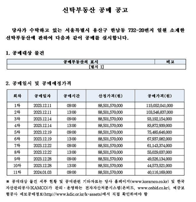 - 공매장소 : 한국자산관리공사(KAMCO)가 관리·운영하는 전자자산처분시스템 (온비드, www.onbid.co.kr)(1588-5321)