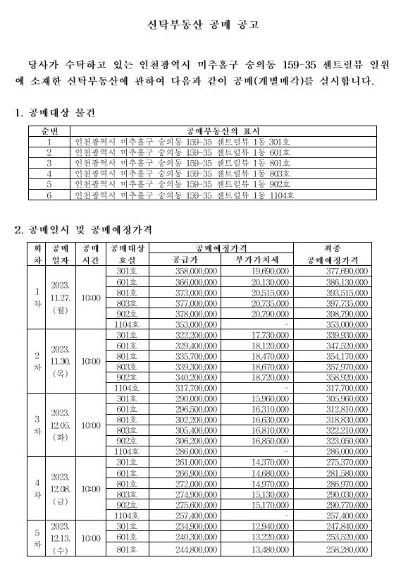 유찰 인천 미추홀구 숭의동 159-35 센트럴뷰 6호실 개별매각 (3차)