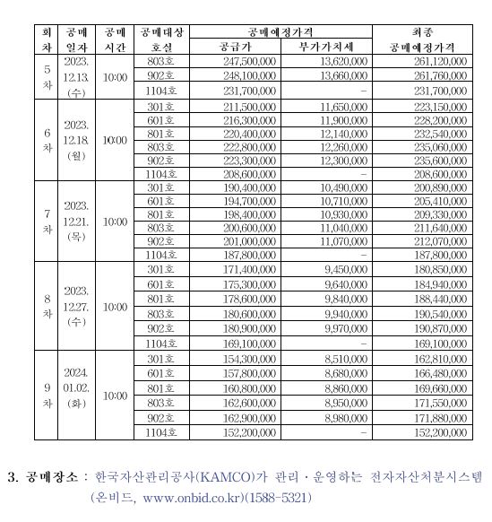 - 공매장소 : 한국자산관리공사(KAMCO)가 관리·운영하는 전자자산처분시스템 (온비드, www.onbid.co.kr)(1588-5321)