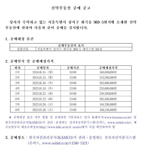 - 공매장소 : 한국자산관리공사(KAMCO)가 관리·운영하는 전자자산처분시스템 (온비드, www.onbid.co.kr)(1588-5321)