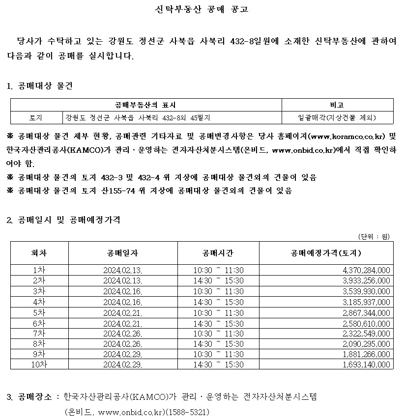 ※ 공매공고 및 입찰참가자 준수규칙 등을 한국자산관리공사(KAMCO)가 관리ㆍ운영하는 전자자산처분시스템(온비드, www.onbid.co.kr)에서 반드시 확인하여 주시기 바랍니다.