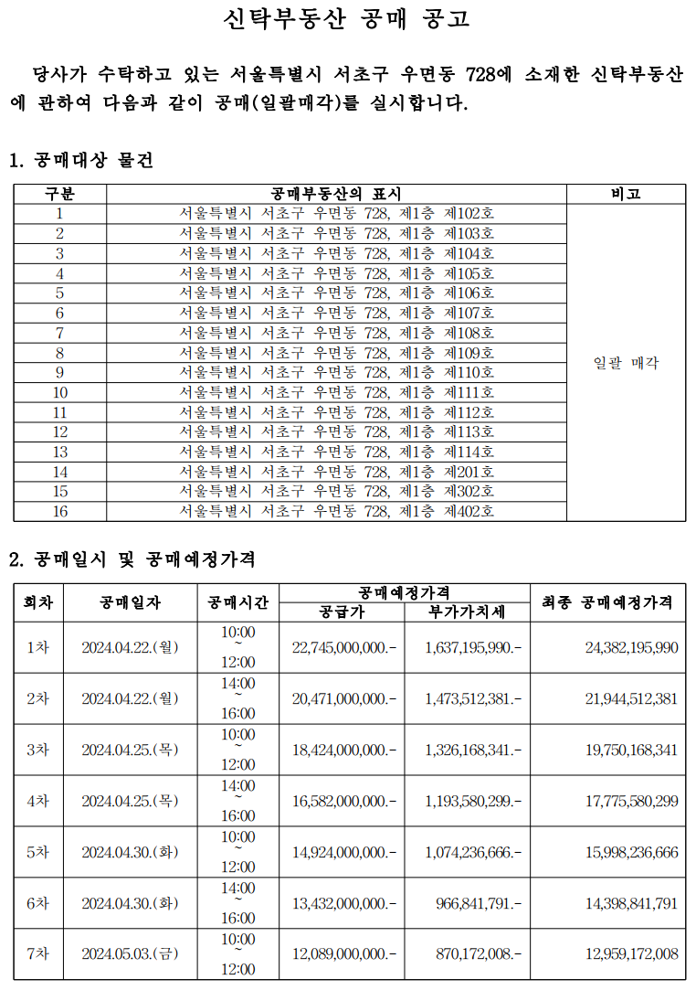 공매중지 서울특별시 서초구 우면동 728, 황금빌딩 102호 외15개호 공매