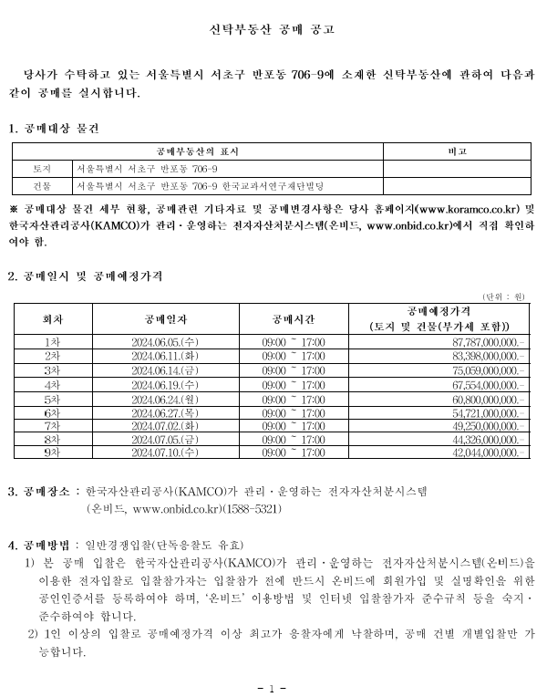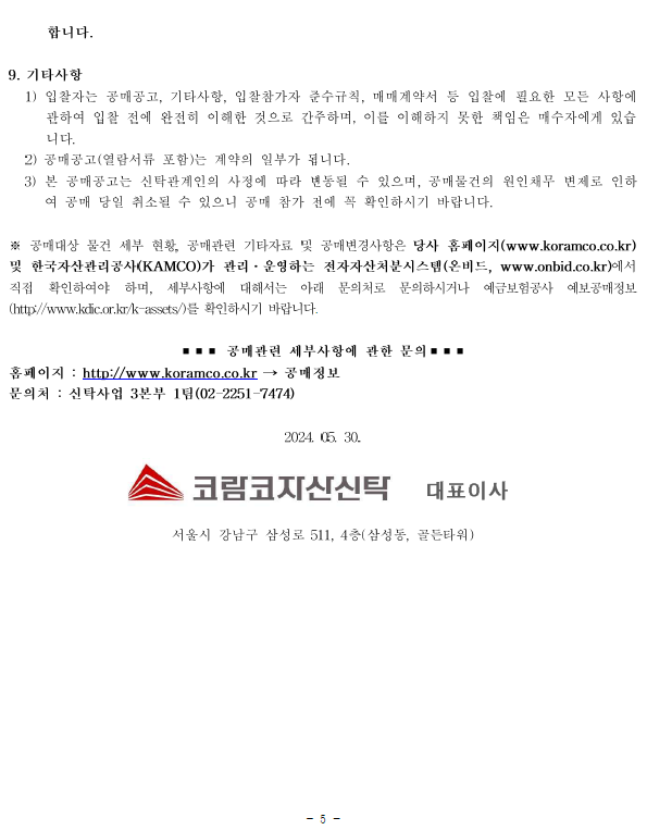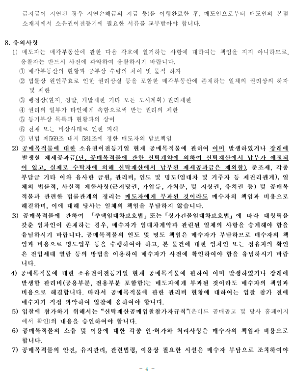 - 공매공고 및 입찰참가자 준수규칙 등을 한국자산관리공사(KAMCO)가 관리ㆍ운영하는 전자자산처분시스템(온비드, www.onbid.co.kr)에서 반드시 확인하여 주시기 바랍니다.