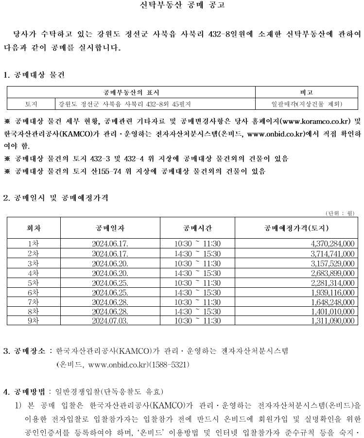 공매중지 강원도 정선군 사북읍 사북리 432-8외 45필지 신탁부동산 공매