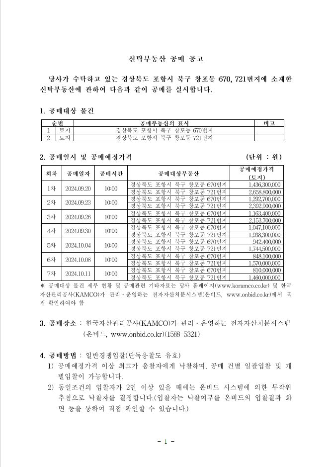 유찰 경상북도 포항시 북구 창포동 670, 721 토지 신탁공매