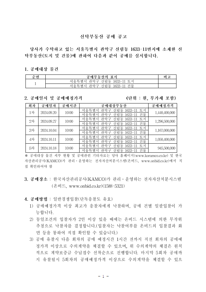 유찰 서울특별시 관악구 신림동 1633-11 토지 및 건물 신탁공매