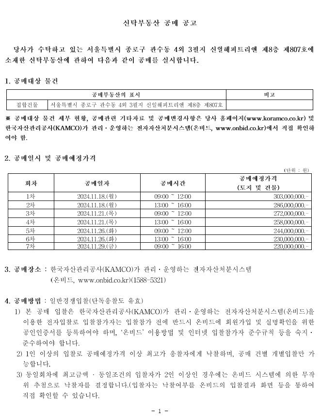 유찰 서울특별시 종로구 관수동 4외 3필지 신일해피트리앤 제8층 제807호 공매