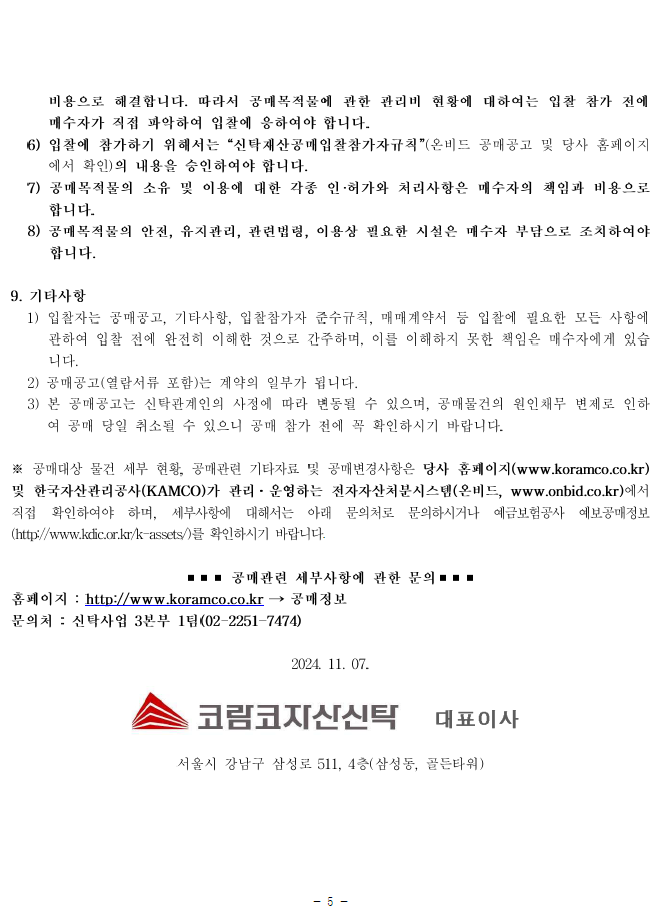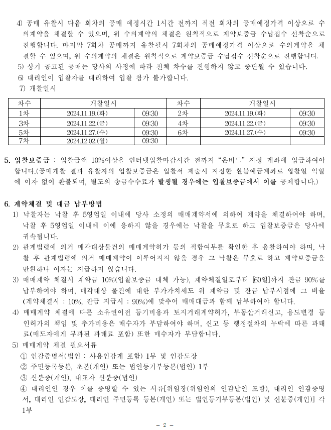 - 공매공고 및 입찰참가자 준수규칙 등을 한국자산관리공사(KAMCO)가 관리ㆍ운영하는 전자자산처분시스템(온비드, www.onbid.co.kr)에서 반드시 확인하여 주시기 바랍니다.