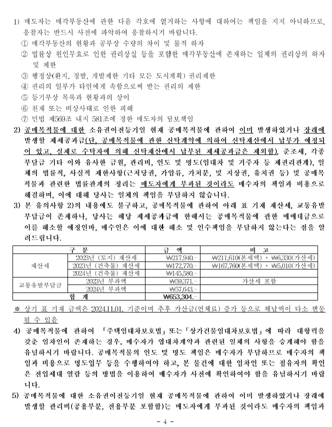 ※ 당사는 등기부상 최초 1회에 한하여 소유권 이전등기 업무만을 수행하고 이를 제외한 매매계약과 관련한 매도인으로서의 일체의 의무 및 책임(매매목적물의 모든 법률적·사실적 하자 또는 장애에 대한 매도인으로서의 의무 및 책임, 불법행위책임, 채무불이행책임 및 하자담보책임을 포함하되 이에 한정되지 않음)을 부담하지 않음을 안내드립니다.