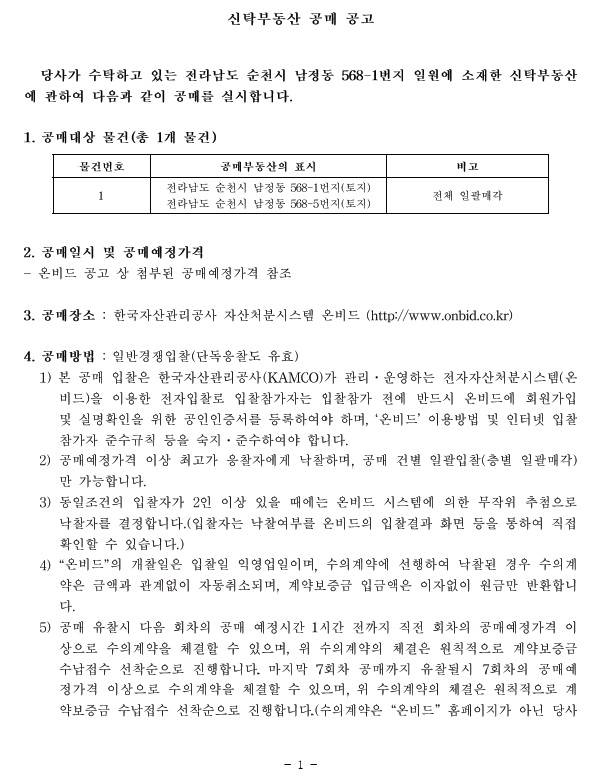 진행중 전라남도 순천시 남정동 568-1번지, 568-5번지 토지 공매공고