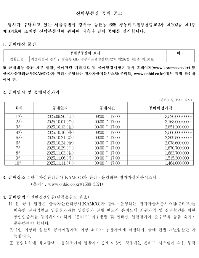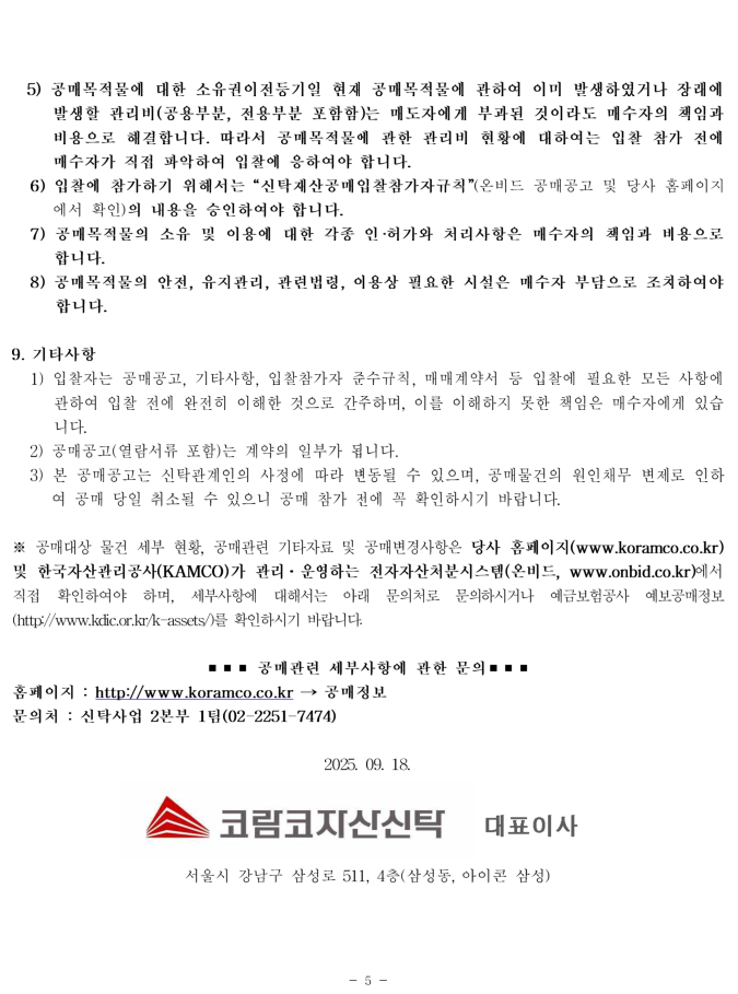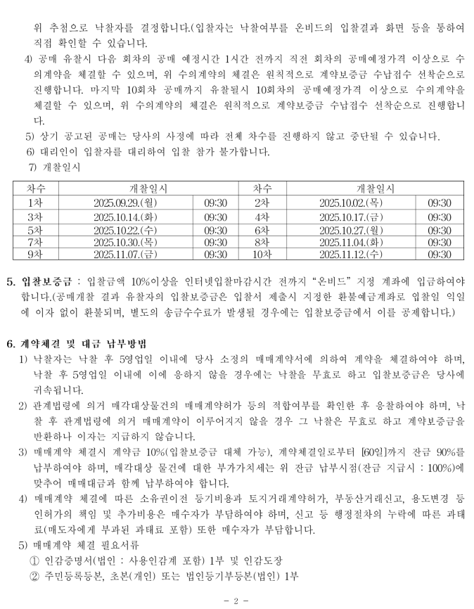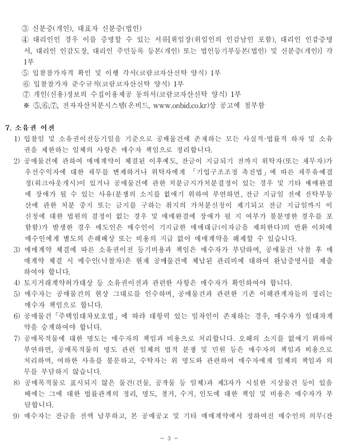 - 공매공고 및 입찰참가자 준수규칙 등을 한국자산관리공사(KAMCO)가 관리ㆍ운영하는 전자자산처분시스템(온비드, www.onbid.co.kr)에서 반드시 확인하여 주시기 바랍니다.