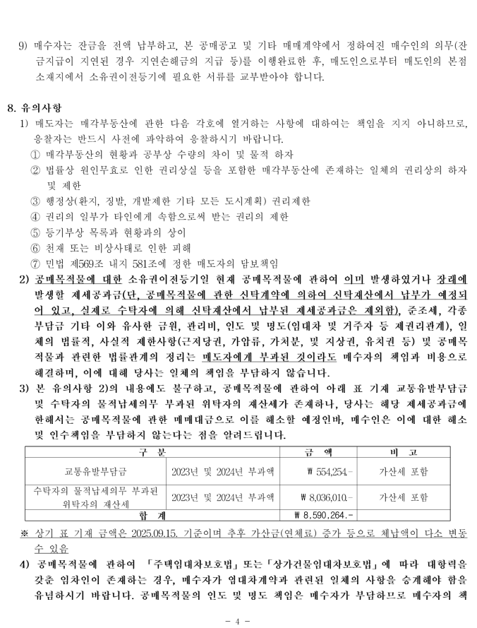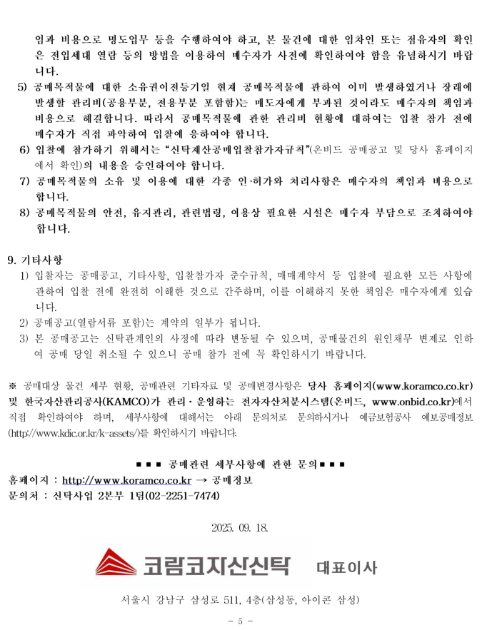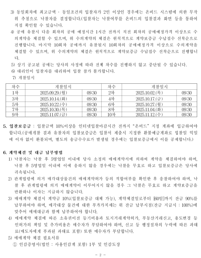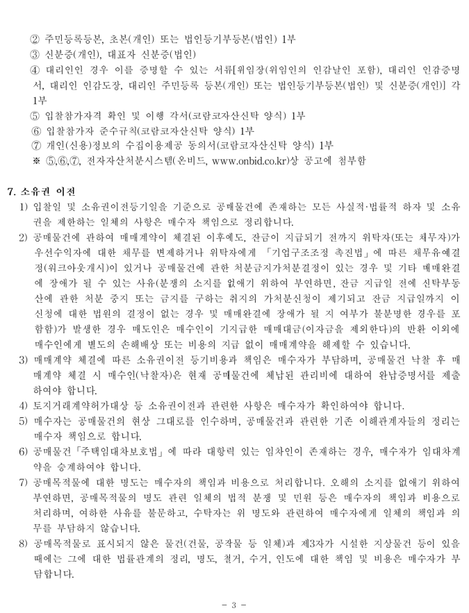 - 공매공고 및 입찰참가자 준수규칙 등을 한국자산관리공사(KAMCO)가 관리ㆍ운영하는 전자자산처분시스템(온비드, www.onbid.co.kr)에서 반드시 확인하여 주시기 바랍니다. ※ 당사는 등기부상 최초 1회에 한하여 소유권 이전등기 업무만을 수행하고 이를 제외한 매매계약과 관련한 매도인으로서의 일체의 의무 및 책임(매매목적물의 모든 법률적·사실적 하자 또는 장애에 대한 매도인으로서의 의무 및 책임, 불법행위책임, 채무불이행책임 및 하자담보책임을 포함하되 이에 한정되지 않음)을 부담하지 않음을 안내드립니다.
