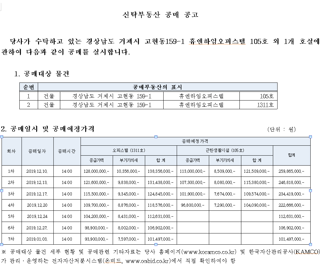 유찰 경상남도 거제시 고현동 159-1 휴엔하임 오피스텔 105호, 1311호 공매