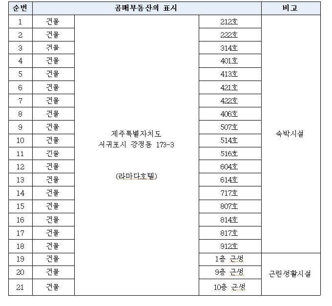 당사가 수탁하고 있는 제주특별자치도 서귀포시 강정동 173-3번지 라마다 호텔 숙박시설 212호 외 17개 호실 및 근린생활시설 3개 호실에 관하여 다음과 같이 공매를 실시 합니다.
